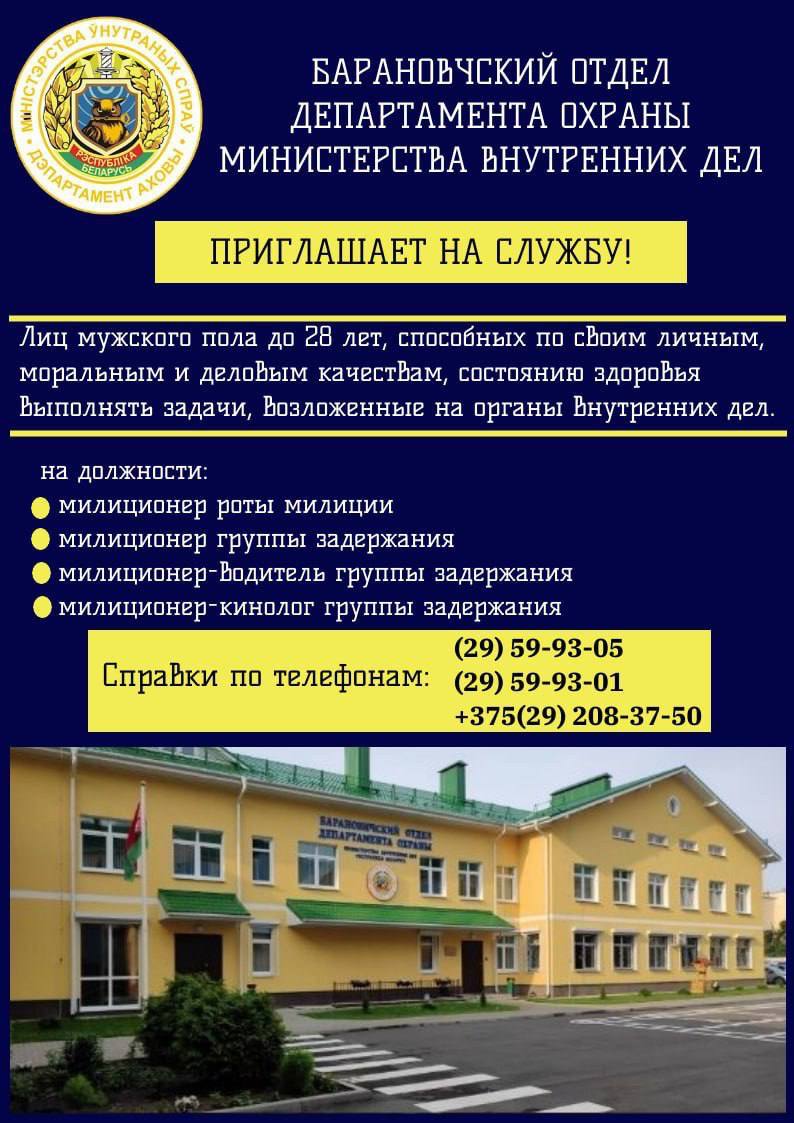 Барановичский отдел Департамента охраны приглашает совершеннолетних граждан, желающих поступить на службу в органы внутренних дел, на должности милиционер, милиционер-водитель группы задержания, милиционер-кинолог группы задержания. Ждем Вас по адресу: г.Барановичи, улица Ленина 10 «А».