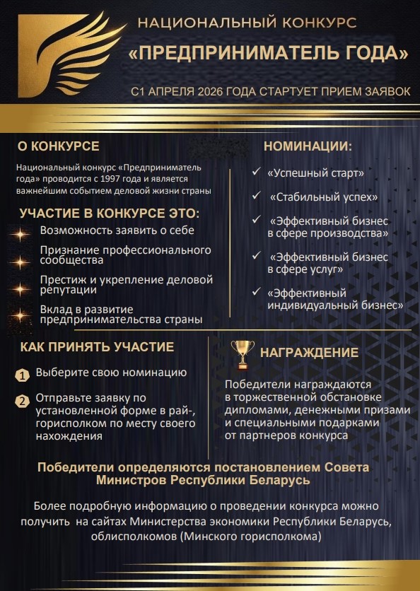 В соответствии с постановлением Совета Министров Республики Беларусь от 17 марта 2016 г. № 207 Министерство экономики объявляет о старте с 1 апреля 2026 г. Национального конкурса «Предприниматель года».